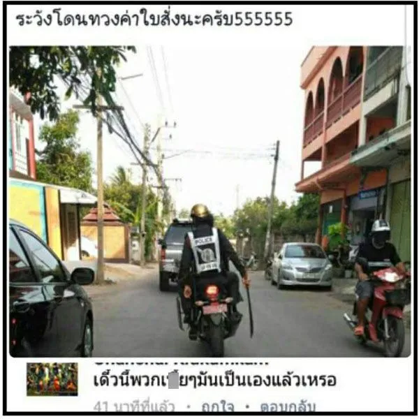 กลายเป็นที่วิพากษ์วิจารรืเป็นอย่างมาก หลังจากที่แฟนเพจ “ตำรวจไทย สู้ๆ” ได้โพสต์รุปที่ได้ทำการแคปหน้าจอเฟซบุ๊กของบุคคลหนึ่ง ที่ได้โพสต์รูปภาพขณะเจ้าหน้าที่ตำรวจรายหนึ่งนั่งซ้อนจักรยานยนต์ โดยในมือถือมีดดาบ พร้อมระบุข้อความว่า “ระวังโดนทวงค่าใบสั่งนะครับ555555” จากนั้นได้มีคนเข้ามาคอมเม้นท์ว่า “เดี๋ยวนี้พวกxxxมันเป็นเองแล้วหรอ”