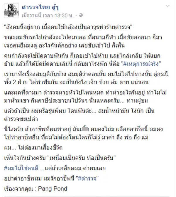 นี่ไงครับ ถ้าอาชีพที่ผมทำอยู่ มันxxx ผมคงไม่มาเลือกอาชีพนี้ ผมคงไปทำอาชีพอื่น ที่ผมไม่ต้องโดนใครก็ไม่รู้ มาด่า ถึง พ่อ ถึง แม่ ผม… ไม่ต้องมาเสี่ยงชีวิต เห็นใจกันบ้างครับ “เหนื่อยเป็นครับ ท้อเป็นครับ” #ผมไม่ใช่คนดี… แต่ถ้าเกลียดผม ด่าผมเลย อย่าด่าอาชีพผม ผมรักอาชีพนี้ “#ตำรวจ”