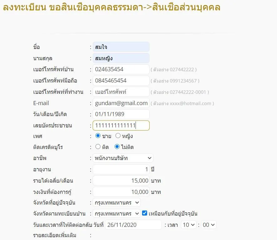 ให้ท่าน กรอกรายละเอียด ให้ครบ ตั้งแต่ชื่อ-นามสกุล, เบอร์โทร, ที่อยู่, อีเมล์, เลขบัตรประชาชน…. ตามตัวอย่าง แบบรูปภาพ ด้านบน กรอกรายละเอียดครบแล้ว จากนั้นกด สมัคร ได้เลย
