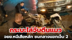 กระบะไล่จับตีนแมว ซิ่ง จยย.หนีเสียหลักชนกลางแยกเจ็บ 2