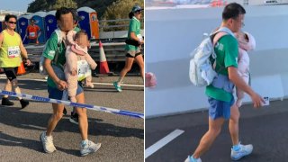 ชายกระเตงทารกลงแข่งวิ่งมาราธอน ถูกเจ้าหน้าที่สั่งให้ออกจากการแข่งขัน