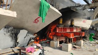 ไฟไหม้ซากเครนถล่มพระราม 2 หน้าโรงแรมปารีส สมุทรสาคร