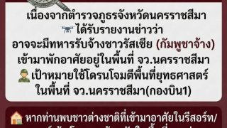 ตำรวจโคราชแจ้งเตือนภัยความมั่นคง รับข้อมูลข่าวกรองพบบุคคลต้องสงสัยโยง “ทหารรับจ้างต่างชาติ” เฝ้าระวังเป้าหมายสำคัญ “กองบิน 1” ขอประชาชนร่วมแจ้งเบาะแสทันที