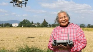 คุณยายสุดเจ๋งใช้โดรนให้ปุ๋ยพืชผลทั่วไร่ผลไม้
