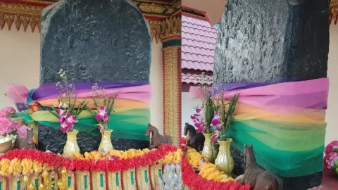 หินท่อนใหญ่ถูกผูกไว้ด้วยผ้าเจ็ดสี เป็นที่มาตามตำนานความเชื่อของแต่ละเมือง (แวงใหญ่)