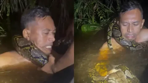 คลิปนาทีชีวิต! งูหลามยักษ์ยาว 6 เมตรลากไกด์ชาวอินโดนีเซียลงไปใต้น้ำ แต่โชคดีที่เพื่อนช่วยทันเวลา