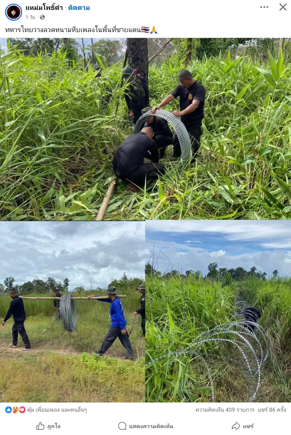 วันนี้ทางเพจแหม่มโพธิ์ดำ ได้แสดงภาพ ทหารกำลังขึงลวดหนาม ตามแนวชายแดน เพื่อป้องกันการเข้ามาก่อกวน วางทุ่นระเบิด หรือ แอบเข้าแดนมาอย่างมากมายของ ชาวกำพูชา เพื่อเจ้ามาหางานทำ หลังจากที่อพยพกลับแต่ไม่มีงานทำ เริ่มอดอยาก หลายเพจได้แสดงภาพกำลังส่งลวดหนามไปยังชายแดน และอีกหลายเพจนำเสนอว่า ให้ติดตั้งบริเวณติดกีบบ่อนการพนัน ด้วยเพราะสามารถป้องกันได้มากกว่า ส่วนบริเวณอื่นทะยอยทำ เพื่อนไคิดยังไงกับการกั้นลวดหนามนี้