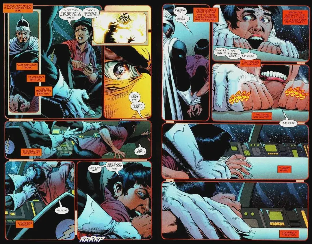 เรื่องราวกลับทวีความรุนแรงขึ้น เมื่อพวกเขาต้องเผชิญหน้ากับ "ด็อกเตอร์ ไลท์" และ แม้ "ด็อกเตอร์ ไลท์" จะยังไม่ได้ค้นพบอัตลักษณ์ของฮีโร่ใดๆ แต่เขาได้บุกเข้าไปที่สำนักงานใหญ่ของ "จัสติสลีก" และ ข่มขืน "ซู ดิบนี่" เมียของ "อีลองเกตเต็ด แมน" อย่างโหดร้าย และ เมื่อ "ด็อกเตอร์ ไลท์" ถูกจับได้ เขาขู่ว่าจะทำแบบเดียวกัน กับเมียของฮีโร่คนอื่นๆ และ จะบอกโลกว่าเขาข่มขืน "ซู ดิบนี่" แต่แทนที่เหล่าฮีโร่จะลบความทรงจำของ "ด็อกเตอร์ ไลท์" พวกฮีโร่กลับไปถึงขั้น "ปรับเปลี่ยนทุกอย่าง ในสมองเขาใหม่ทั้งหมด" โดยให้ "ซาทานนา" เป็นคนทำ ซึ่งนั่นเป็นเหตุผลว่าทำไม "ด็อกเตอร์ ไลท์" ถึงเปลี่ยนจากผู้ร้ายระดับ A ในลิสต์ ของ "จัสติสลีก" ไปเป็นคนที่โดน "ทีนไททันส์" จัดการแบบง่ายๆนั่นเอง