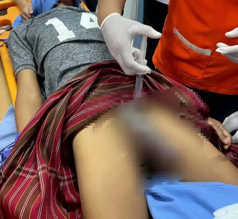 แล้วผลที่ตามมา คือ อวัยวะเพศของเขาบวมเป่ง จนมีขนาดเท่ากำปั้น และ ปวดจนต้องร้องขอให้ครอบครัว พาไปส่งโรงพยาบาลเป็นการด่วน แต่เนื่องจากโรงพยาบาลไม่มีเครื่องมือตัด จึงร้องขอไปยังเจ้าทีมเจ้าหน้าที่กู้ภัย ให้มาช่วยตัดโลหะดังกล่าวออก โดยแพทย์ได้ทำการฉีดยาชา แล้วทางทีมกู้ภัยได้ใช้เครื่องเจียร ตัดห่วงสแตนเลส ท่ามกลางความตื่นเต้นและประกายไฟที่พุ่งออกมา เหมือนกับในภาพยนตร์เลยทีเดียว ซึ่งเหตุการณ์ทั้งหมดใช้เวลาไปประมาณ 10 นาที แต่ส่วนปลายของอวัยวะเพศ ยังคงบวมอย่างน่าตกใจ...