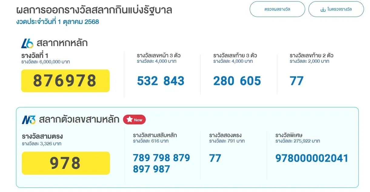 ผลการออกรางวัล สลากตัวเลขสามหลัก N3 งวดประจำวันที่ 1 ตุลาคม 2568