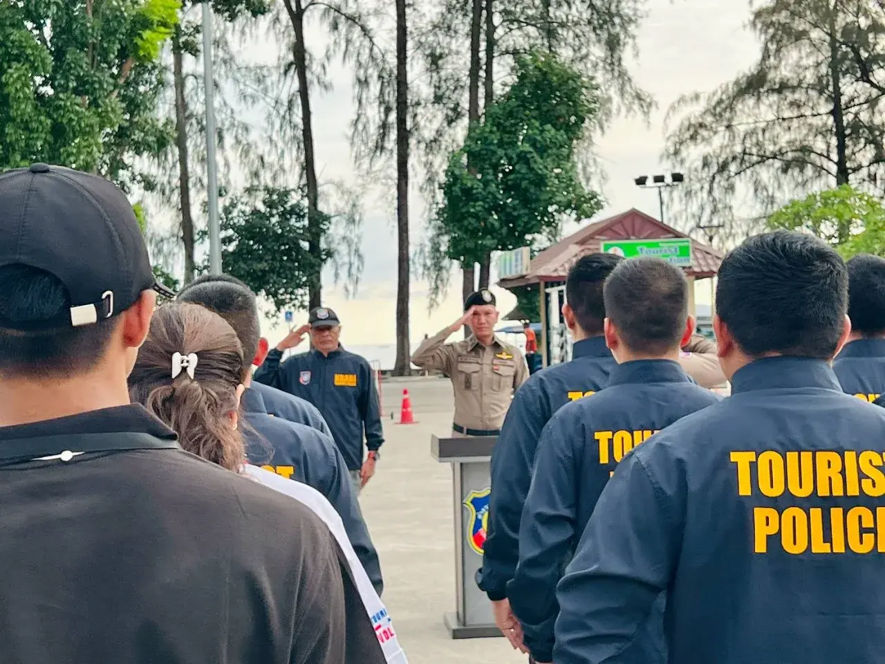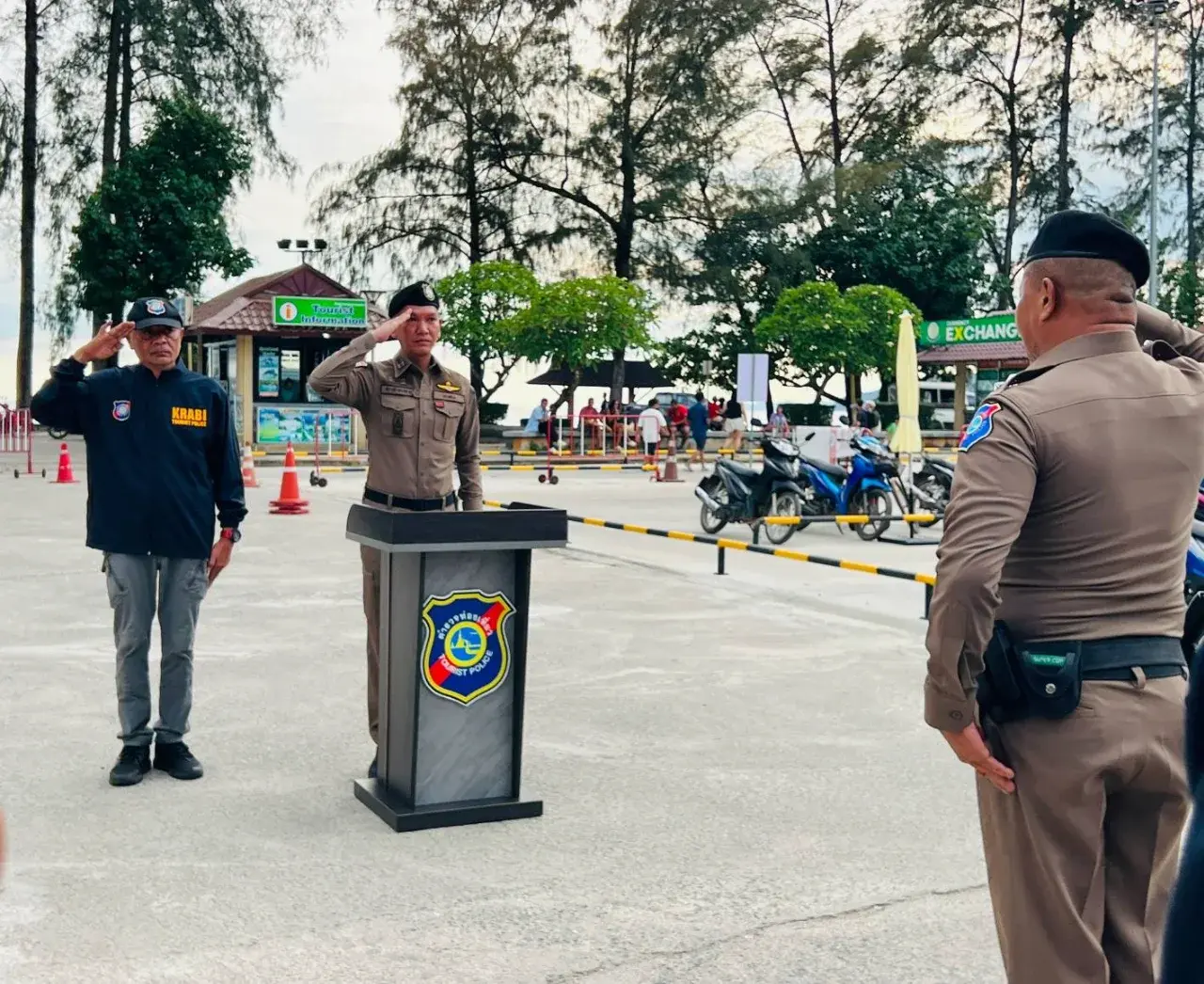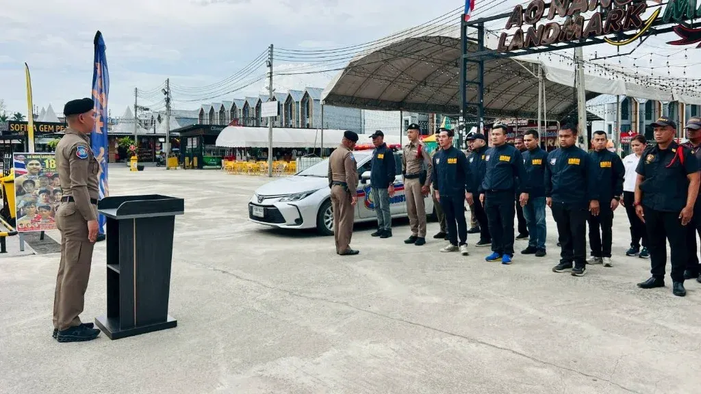 บรรยากาศในพื้นที่เป็นไปอย่างคึกคัก เจ้าหน้าที่ตั้งแถวอย่างพร้อมเพรียงก่อนออกปฏิบัติการตรวจตราพื้นที่ท่องเที่ยวสำคัญ โดยเฉพาะย่านอ่าวนาง–คลองม่วง–ตัวเมืองกระบี่ ซึ่งเป็นโซนหลักที่นักท่องเที่ยวหนาแน่น