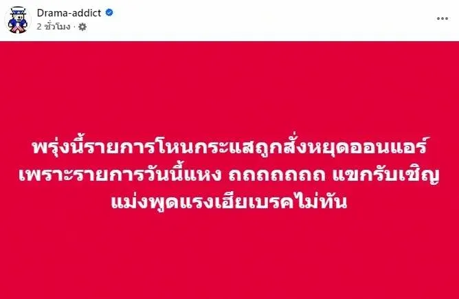 เพจ Drama-addict รายงานข่าวว่า รายการ โหนกระแส จะถูก สั่งหยุดออนแอร์ในวันถัดไป เนื่องจากแขกรับเชิญพูดเรื่องราวแรงเกินไปจน เฮียเบรคไม่ทัน ซึ่งสร้างความตื่นตระหนกให้แฟนรายการและผู้ติดตาม