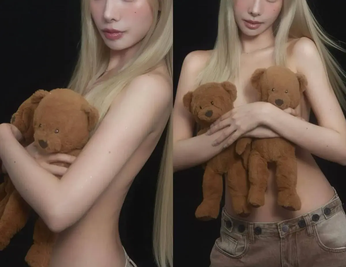 ในภาพ เธอเลือกสวมเพียงกางเกงยีนสีอ่อนตัดกับผมบลอนด์ทองที่เซ็ตอย่างมีวอลุ่ม พร้อมกับใช้ตุ๊กตาหมีตัวโตปิดหน้าอกไว้พอดี เพิ่มความละมุนและขี้เล่นให้กับภาพโดยไม่ต้องโป๊จนน่าเกลียด