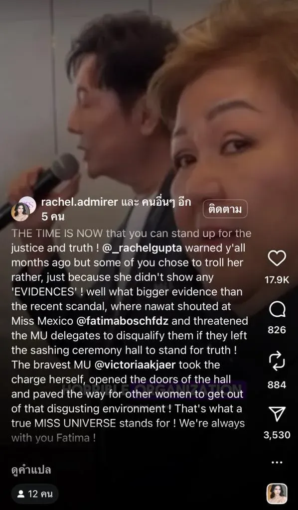 “ถึงเวลาแล้วที่คุณจะลุกขึ้นเพื่อความยุติธรรมและความจริง! ฉันได้เตือนทุกคนไว้เมื่อหลายเดือนก่อน แต่บางคนกลับล้อเลียนเธอ แค่เพราะเธอไม่มีหลักฐานใด ๆ ! แล้วเรื่องอื้อฉาวล่าสุดนี้ไม่ใช่หลักฐานที่ใหญ่พอหรือ? ที่ณวัฒน์ตะโกนใส่ Miss Mexico และขู่ผู้เข้าประกวด Miss Universe ว่าจะถูกตัดสิทธิ์หากพวกเธอออกจากห้องเพื่อสู้กับความจริง!