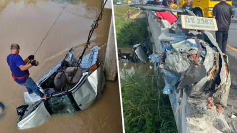 กู้ระทึก!กระบะซิ่งเหินฟ้าชนราวสะพานกระเด็นตกคลองจมดิ่ง กู้ภัยเร่งกู้ ส่วนคนขับยังไม่ทราบชะตากรรม