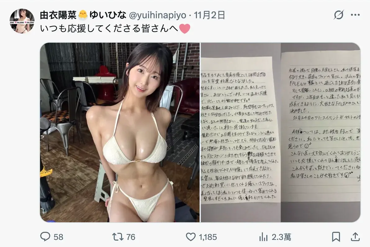 ยูกิ ฮินะ (Yui Hina) ตัดสินใจไม่ต่อสัญญา Faleno Star! สู่การเป็นนักแสดงอิสระเต็มตัว?