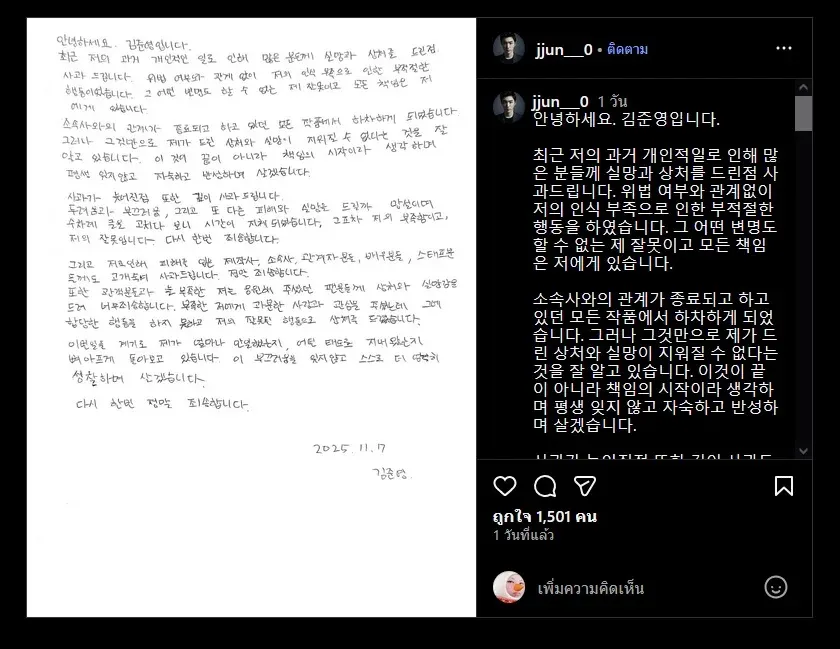ต้นสังกัดของ "คิม จุน ยอง" ก็พยายามอย่างหนัก เพื่อระงับข้อขัดแย้งนี้ โดยออกแถลงการณ์เน้นย้ำว่า "คิมจุนยองไม่ได้มีส่วนเกี่ยวข้องกับกิจกรรมที่ผิดกฎหมายใดๆ" อย่างไรก็ตาม ชาวเน็ตก็ได้รุมด่าเขาจนย่อยยับไปแล้ว หลังจากนั้นบริษัทต้นสังกัดของเขา ก็เงียบหายไปหลายวัน จนในที่สุด "คิม จุน ยอง" ก็ได้โพสต์คำขอโทษด้วยลายมือบน IG ส่วนตัวของเขา โดยยอมรับว่า "ผมกระทำการที่ไม่เหมาะสม เนื่องจากขาดความเข้าใจ" และ "ผมจะรับผิดชอบอย่างเต็มที่!!" และ "ผมโทษทีมงานผลิต บริษัทผลิต ผู้สนับสนุน และ แฟนๆทุกคน" และ "ผมจะไตร่ตรองถึงการกระทำของเขาอย่างลึกซึ้ง!!"