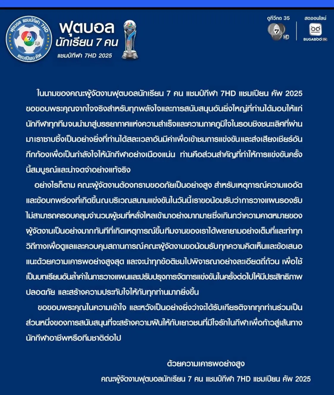 อย่างไรก็ตาม คณะผู้จัดงานต้องกราบขออภัยเป็นอย่างสูง สำหรับเหตุการณ์ความแออัดและข้อบกพร่องที่เกิดขึ้น ณ บริเวณสนามแข่งขันในวันนี้ เราขอน้อมรับว่า การวางแผนรองรับไม่สามารถครอบคลุมจำนวนผู้ชมที่หลั่งไหลเข้ามาอย่างมากมาย ซึ่งเกินกว่าความคาดหมายของผู้จัดงานเป็นอย่างมาก ทันทีที่เกิดเหตุการณ์ขึ้น ทีมงานของเราได้พยายามอย่างเต็มที่และทำทุกวิถีทางเพื่อดูแลและควบคุมสถานการณ์ คณะผู้จัดงานขอน้อมรับ ทุกความคิดเห็นและข้อเสนอแนะด้วยความเคารพอย่างสูงสุด และจะนำทุกข้อติชมไปพิจารณาอย่างละเอียดถี่ถ้วน เพื่อใช้เป็นบทเรียนอันล้ำค่าในการวางแผนและปรับปรุงการจัดการแข่งขันในครั้งต่อไปให้มีประสิทธิภาพ ปลอดภัย และสร้างความประทับใจให้กับทุกท่านมากยิ่งขึ้น