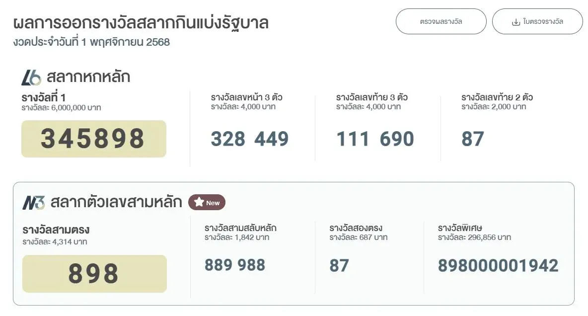 ผลการออกรางวัล สลากตัวเลขสามหลัก N3 งวดประจำวันที่ 1 พฤศจิกายน 2568