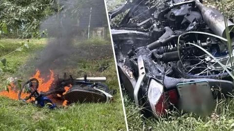 ไฟไหม้ระทึก!จยย.แต่งซิ่งล้มกลางสวนยางไฟลุกท่วมวอด