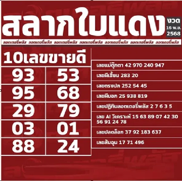 10 เลขขายดี "สลากใบแดง" งวดวันที่ 16 พฤศจิกายน 68 พรุ่งนี้รวย คอหวยส่องด่วน!!