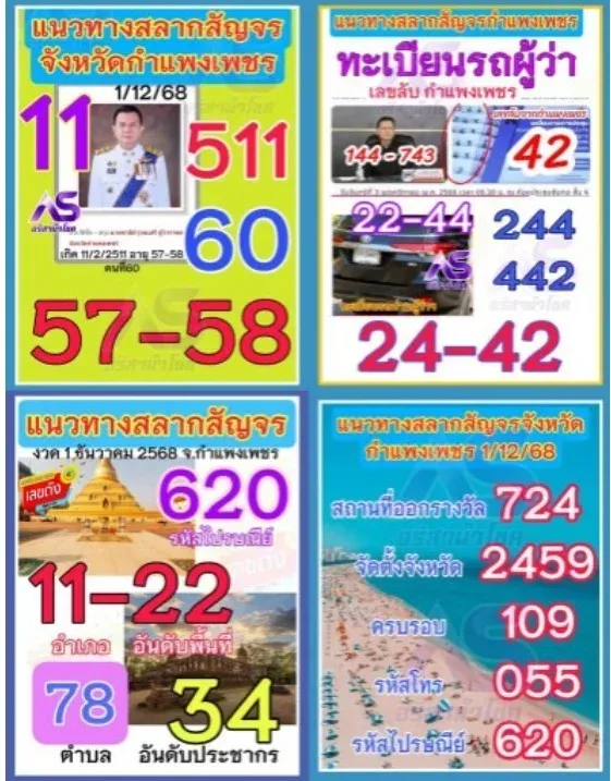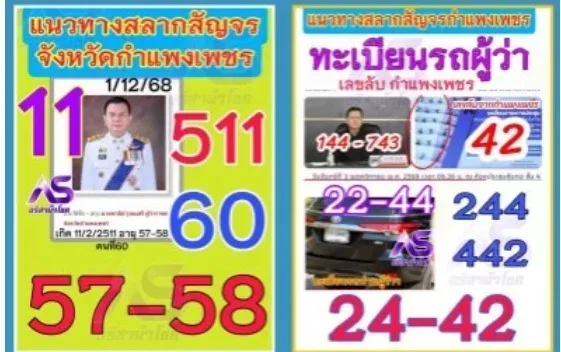 เลขเด็ด "สลากสัญจร" งวดวันที่ 1 ธันวาคม 68..ส่องเลย เลขไหนมาแรง! สำหรับการออกหวยในงวดนี้ กองสลากฯ ได้จัดหวยสัญจรขึ้นที่ จ.กำแพงเพชร วันนี้เราเลยนำข้อมูลที่เกี่ยวข้องกับจังหวัดนี้มานำเสนอให้บรรดาคอหวยได้พิจารณากัน เพื่อสรรหาเลขเด็ดที่โดนใจแล้วเอาไปซื้อลอตเตอรี่ สำหรับใครที่ยังไม่มีแนวทางเลขเด็ดก็ลองใช้วิธีนี้ดูใครจะไปรู้อาจจะถูกรางวัลใหญ่ก็ได้ รีบดูแล้วรีบซื้อก่อนที่จะกลายเป็นเลขอั้น เพราะหวยดังทุกงวดมักจะเป็นเลขอั้นในภายหลัง ทั้งนี้เราก็ได้รวบรวมข้อมูลสถิติหวยสัญจรปี 2568 มาใช้เป็นแนวทางด้วย ยังไงก็ลองพิจารณากันดู