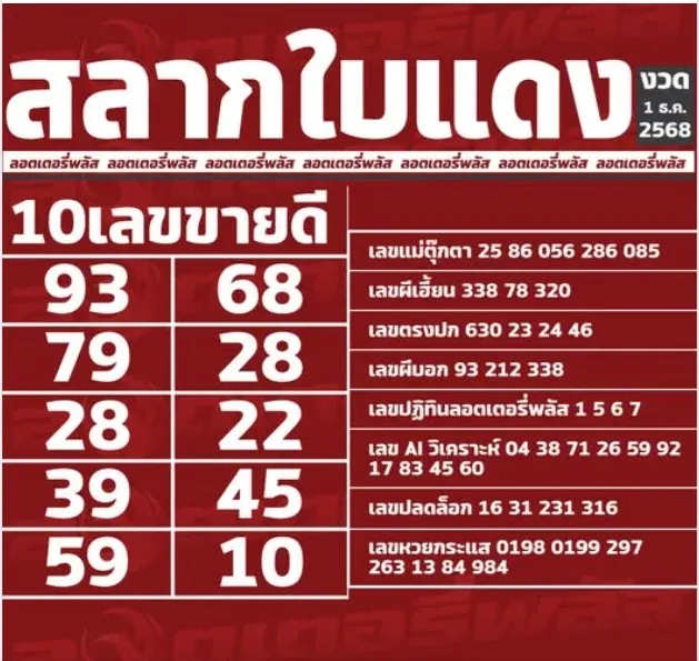 10 เลขขายดี "สลากใบแดง" งวดวันที่ 1 ธันวาคม 68 พรุ่งนี้รวย คอหวยส่องด่วน!!