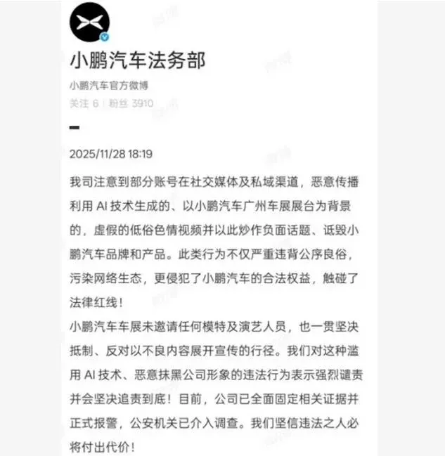 อย่างไรก็ตาม ทางบริษัท XPeng Motors ได้ออกมากล่าวปฏิเสธว่า "เราไม่มีส่วนเกี่ยวข้องใดๆกับคลิปวิดีโอดังกล่าว เนื่องจากบูธของเราไม่ได้จ้างพริ๊ตตี้มาเลยสักคน เนื่องจากเราเชื่อมันในผลิตภัณฑ์รถยนต์ไฟฟ้าของเรา" และ "เราคิดว่าคลิปดังกล่าวผ่านการเสริมเติมแต่งด้วย ระบบปัญญาประดิษฐ์ [Ai]" และ "ตอนนี้ทางเราได้เก็บรวบรวมหลักฐาน และ ยื่นเรื่องให้ตำรวจตรวจสอบแล้ว ซึ่งเจ้าหน้าที่ตำรวจได้เริ่มกระบวนการสอบสวนแล้ว"
