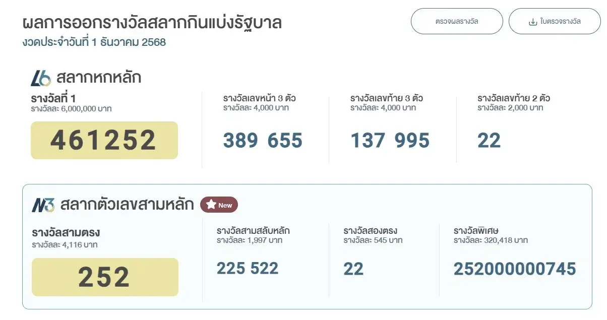 ผลการออกรางวัล สลากตัวเลขสามหลัก N3 งวดประจำวันที่ 1 ธันวาคม 2568