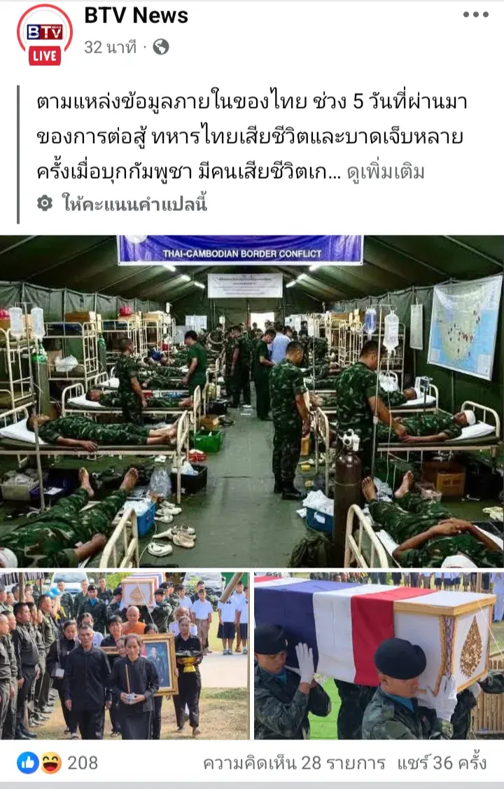 ทางเพจฝั่งกัมพูชา ได้โพสต์อ้างอิง แหล่งข้อมูลภายในของไทย พร้อมใส่ตัวเลขเวอร์วังถึงขั้นว่า ตลอด 5 วันที่ผ่านมาของการสู้รบ ทหารไทยเสียชีวิตเกือบ 1,000 นาย บาดเจ็บกว่า 2,000 นาย แถมยัดดราม่าเพิ่มว่า ศพทหารไทยถูกโยนทิ้งป่า ยังไม่ได้เก็บ หลังจากโดนกัมพูชาบุกสวนกลับในวันที่ 11 ธันวาคม