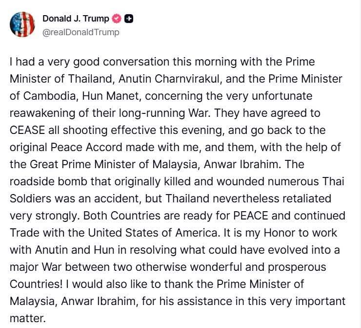 มาดูข้อความของทรัมป์กัน เช้านี้ผมได้สนทนาอย่างดีเยี่ยมกับนายกรัฐมนตรีของประเทศไทย (เช้านี้ของสหรัฐ คือตอนดึกของไทยเมื่อวานนี้) นายอนุทิน ชาญวีรกูล และนายกรัฐมนตรีของกัมพูชา นายฮุน มาเนต เกี่ยวกับการปะทุขึ้นอีกครั้งของสงครามที่ยืดเยื้อมานาน