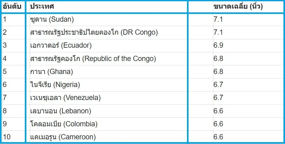 ทั้งนี้จากการจัดอันดับในปี 2025 ก็พบว่า ประเทศที่มีขนาดอวัยวะเพศชายใหญ่ที่สุดในโลกนั้น ก็มีด้วยกันสองประเทศ คือ ซูดาน และสาธารณรัฐประชาธิปไตยคองโก โดยมีขนาดความยาวเฉลี่ยตอนแข็งตัวสุดๆ อยู่ที่ 7.1 นิ้ว ส่วนประเทศมหาอำนาจอย่างสหรัฐอเมริกา สหราชอาณาจักร และรัสเซีย ก็มีค่าเฉลี่ยเท่ากันคืออยู่ที่ 5.6 นิ้วเท่านั้น แต่กลับกัน ประเทศไทยก็ไม่ติดโผ 1 ใน 10 ดังกล่าว คือ มีขนาดความยาวเฉลี่ยตอนแข็งตัวอยู่ที่ 3.7 นิ้ว ตามมาด้วยเกาหลีเหนือและกัมพูชา ซึ่งมันสะท้อนให้เห็นว่าประชากรในแต่ละภูมิภาคนั้น จะมีสรีระที่แตกต่างกันอันส่งผลต่อขนาดของอวัยวะเพศด้วย