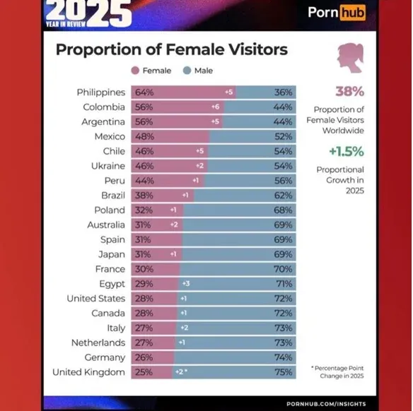 Pornhub เผยสถิติปี 2025..สาวชาติไหนดู "หนังโป๊" มากที่สุดในโลก ใบ้ให้เลยว่าเป็นเพื่อนบ้านเรา ไม่รู้ว่าคุณเดาถูกไหม ? ว่าผู้หญิงประเทศใดดู Pornhub มากที่สุดในโลก ประจำปี 2025