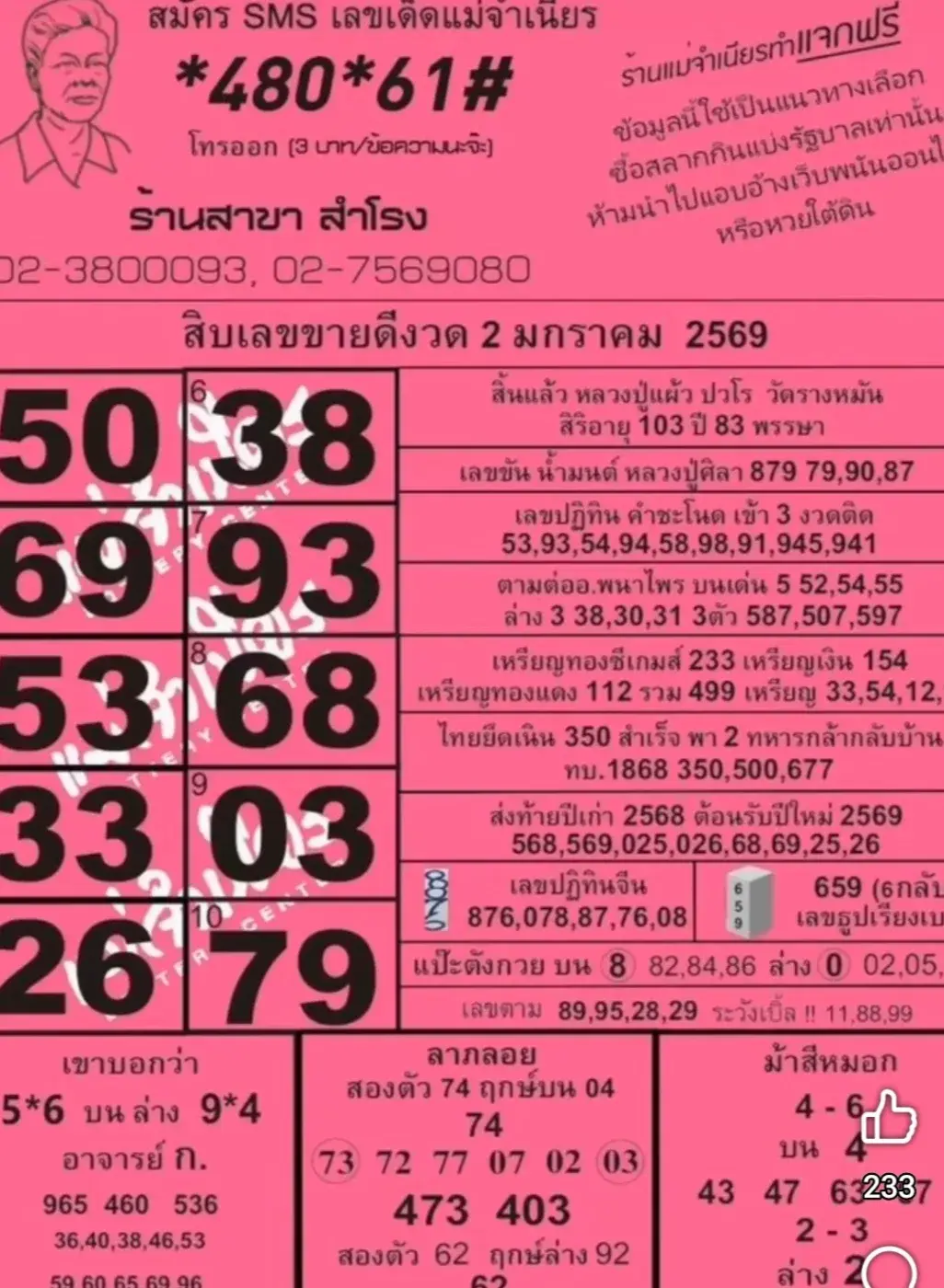 เลขธูปเจ๊ฟองเบียร์ ลุ้นงวด 2 มกราคม 2569