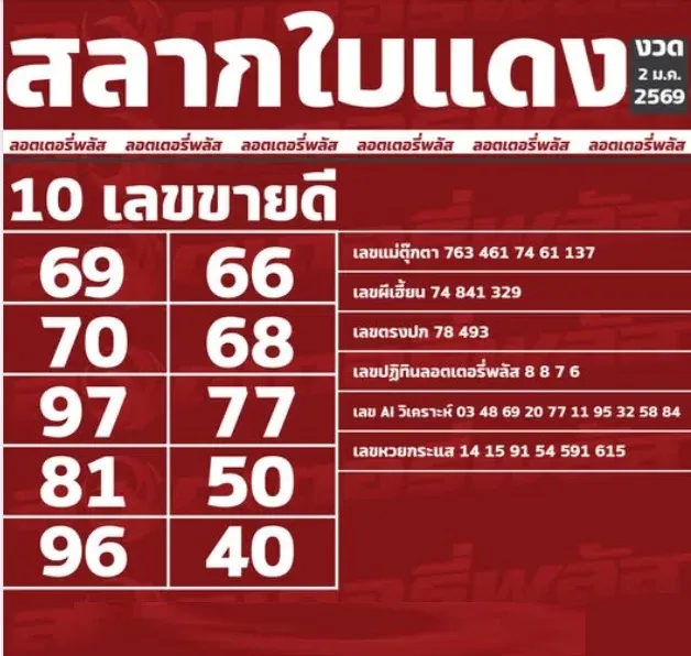 10 เลขขายดี "สลากใบแดง" งวดวันที่ 2 มกราคม 69..โชคดีรับปีใหม่ ใครอยากรวยส่องด่วน!!