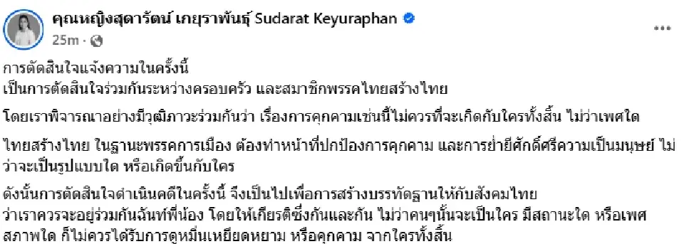 คุณหญิงสุดารัตน์ยืนยันว่าการแจ้งความโดม ปกรณ์ ลัม เป็นการตัดสินใจร่วมกันของครอบครัวและสมาชิกพรรคไทยสร้างไทย