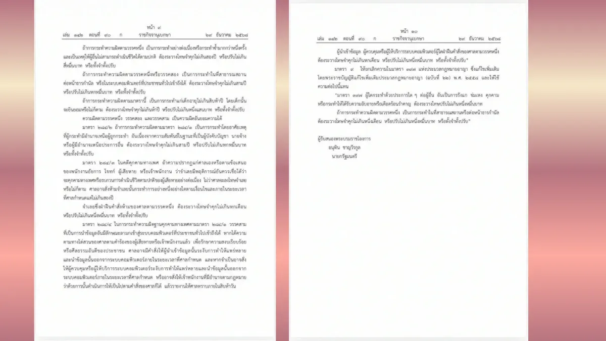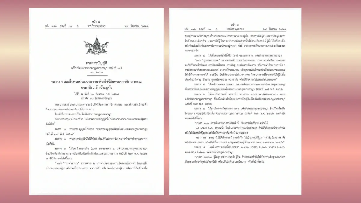ตั้งแต่วันที่ 30 ธันวาคม 2568 เป็นต้นไป พระราชบัญญัติแก้ไขเพิ่มเติมประมวลกฎหมายอาญา (ฉบับที่ 30) ได้ประกาศใช้อย่างเป็นทางการ โดยมีการเพิ่มบทลงโทษที่รัดกุมขึ้น:
