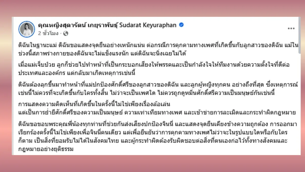 ความเคลื่อนไหวที่สำคัญคือการที่ "คุณหญิงสุดารัตน์ เกยุราพันธุ์" ในฐานะแม่ ได้ออกมาประกาศจุดยืนปกป้องลูกสาวอย่างถึงที่สุด โดยย้ำว่าการคุกคามทางเพศไม่ใช่เรื่องล้อเล่น และเป็นการย่ำยีศักดิ์ศรีความเป็นมนุษย์ ซึ่งถือเป็นกรณีตัวอย่างที่ชัดเจนในการลุกขึ้นมา "ปกป้องสิทธิ์" และใช้กฎหมายฉบับใหม่เข้าจัดการอย่างเป็นรูปธรรม