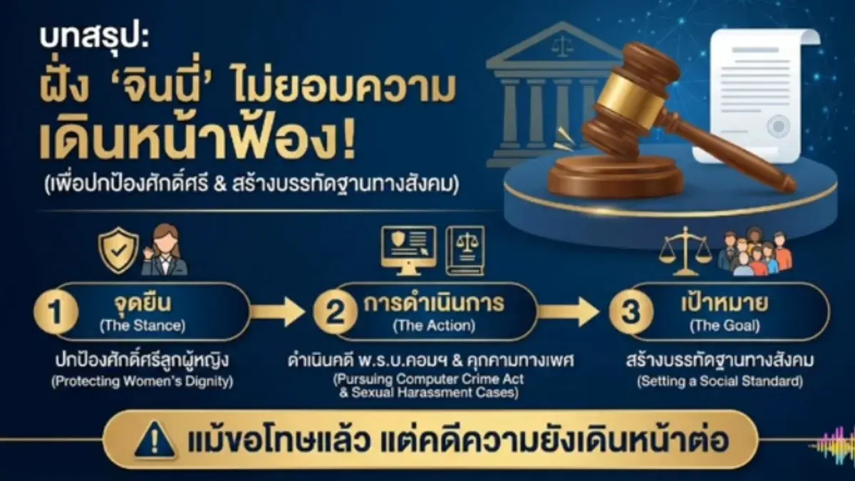 อย่างไรก็ตาม ฝั่งผู้เสียหายและครอบครัวนำโดยคุณหญิงสุดารัตน์ ได้แสดงจุดยืนที่ชัดเจนว่า "คำขอโทษผ่านโซเชียล" อาจไม่เพียงพอต่อการเยียวยาศักดิ์ศรีที่ถูกย่ำยี การตัดสินใจดำเนินคดีตามพระราชบัญญัติแก้ไขเพิ่มเติมประมวลกฎหมายอาญาฉบับใหม่ จึงเป็นการลากเส้นเพื่อบอกว่า พฤติกรรมคุกคามไม่ใช่เรื่องล้อเล่น และความมึนเมาไม่ใช่ข้ออ้างทางกฎหมาย คดีนี้จึงถูกจับตามองในฐานะกรณีศึกษา (Case Study) ของการสร้างบรรทัดฐานใหม่ให้สังคมไทยมีความรับผิดชอบต่อการสื่อสารมากขึ้น