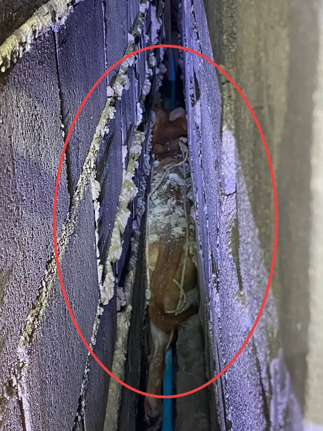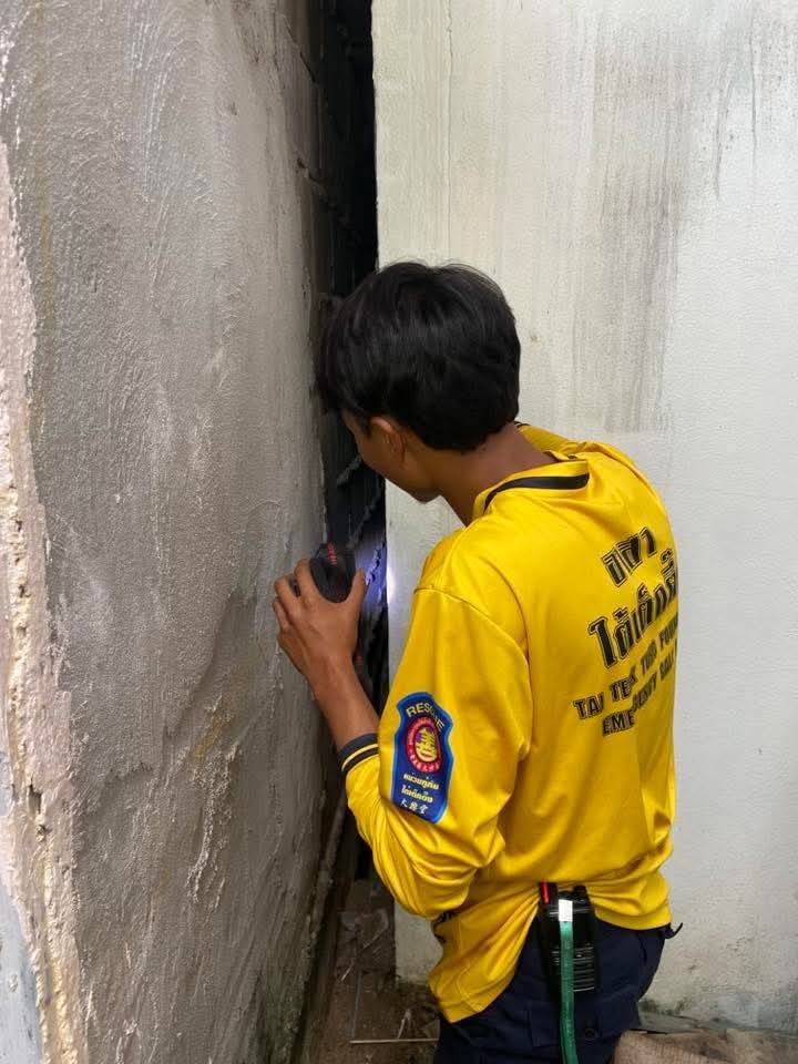 ต่อมาเจ้าหน้าที่กู้ภัยมูลนิธิใต้เต็กตึ้งกำแพงเซา รับแจ้งขอความช่วยเหลือจากชาวบ้าน จึงรีบเดินทางไปพร้อมอุปกรณ์ตัดถ่างและเครื่องเจาะไปตรวจสอบพบว่าสุนัขพันธุ์ไทยตัวดังกล่าวไม่สามารถนำออกมาได้ กู้ภัยใต้เต็กตึ้ง ขออนุญาตเจ้าของบ้านเจาะกำแพงเพื่อช่วยเหลือสุนัขออกมาได้อย่างทุลักทุเล และปลอดภัย