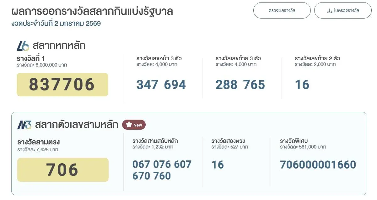 ผลการออกรางวัล สลากตัวเลขสามหลัก N3 งวดประจำวันที่ 2 มกราคม 2569