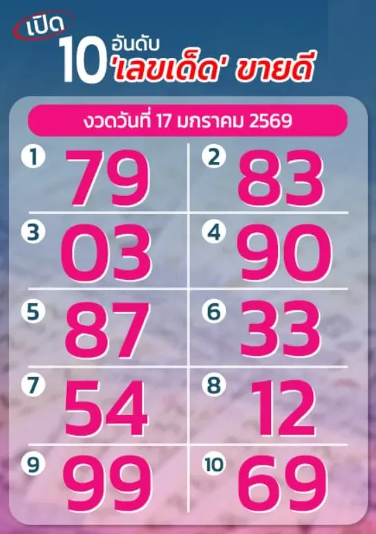 มาแล้ว! เปิด 10 อันดับเลขเด็ดขายดี งวดวันที่ 17 มกราคม 69..อยากรวย รีบส่องเลย!!