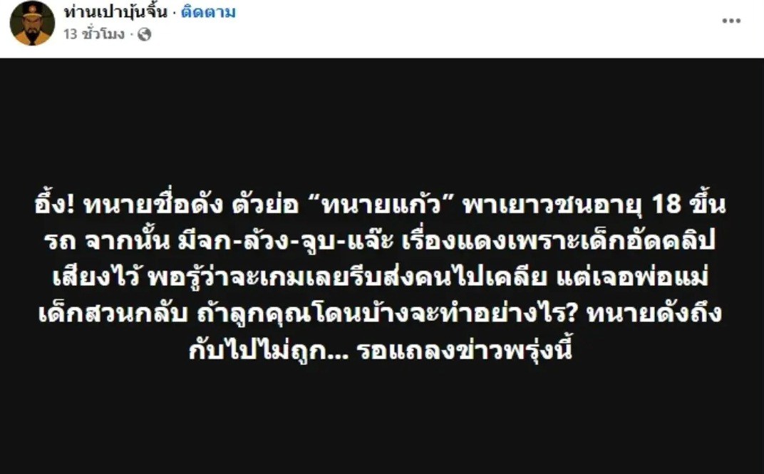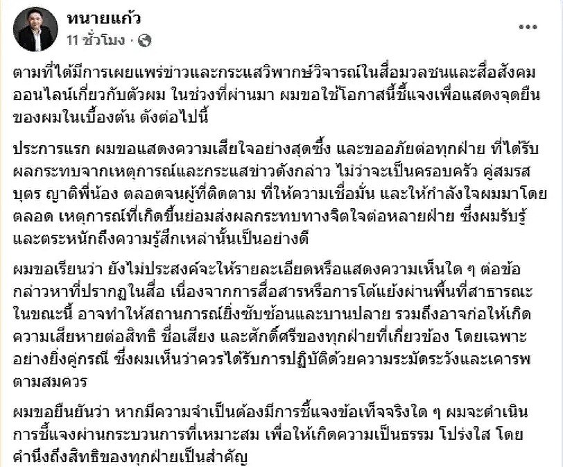 ขออภัยผู้ได้รับผลกระทบ: ทนายแก้วระบุว่าขอแสดงความเสียใจอย่างสุดซึ้งและขออภัยต่อทุกฝ่ายที่ได้รับผลกระทบจากกระแสข่าว ไม่ว่าจะเป็นครอบครัว คู่สมรส บุตร ญาติพี่น้อง ตลอดจนผู้ที่ให้ความเชื่อมั่นและติดตามผลงานมาโดยตลอด