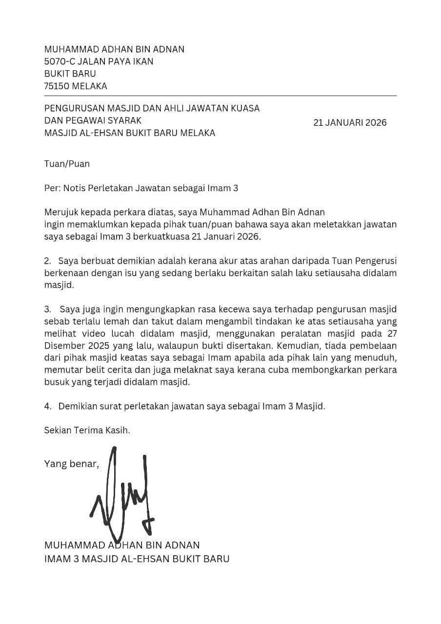 อย่างไรก็ตาม อิหม่าม "มูฮัมหมัด อัซฮาน อัดนัน" เป็นผู้ที่ยื่นใบลาออกก่อน โดยได้ยื่นหนังสือลาออกเมื่อวันที่ 21 มกราคม 2026 โดยระบุว่า "เป็นไปตามคำแนะนำของฝ่ายบริหารมัสยิด อันเนื่องมาจากปัญหาที่เกิดขึ้น..."