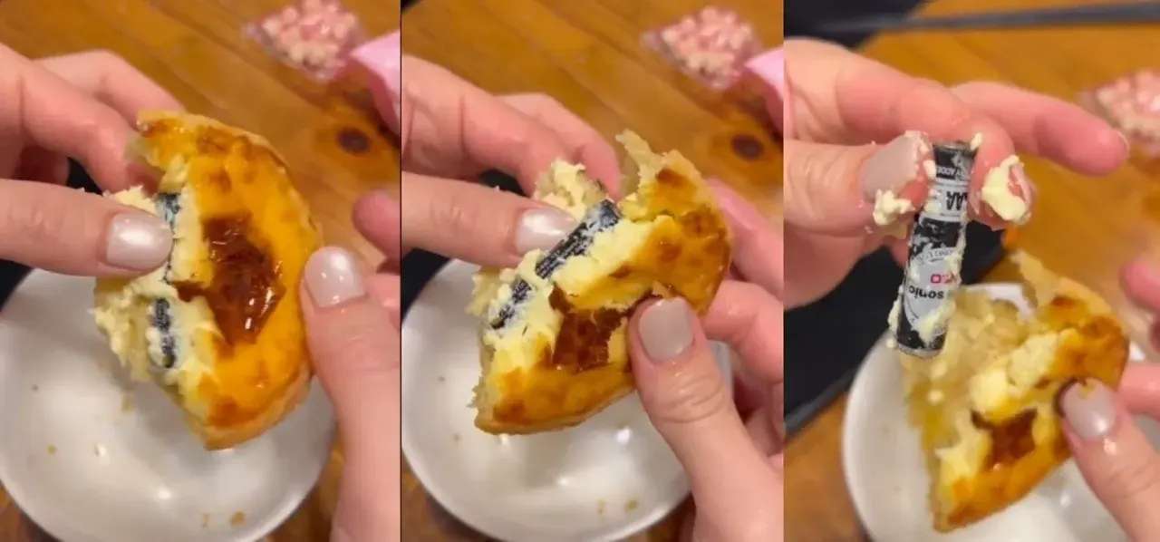 ก่อนรับประทาน เขาสังเกตเห็นเงาดำๆที่ก้นทาร์ต ตอนแรกยังเข้าใจผิดคิดว่า เป็นไส้รสน้ำตาลดำผสมโมจิ แต่จากภาพและวิดีโอที่เผยแพร่ เห็นได้ชัดว่ามีแบตเตอรี่สภาพสมบูรณ์ ถูกฝังอยู่ในตัวขนมจริง ซึ่งได้สร้างความตกตะลึงให้กับชาวเน็ตจำนวนมาก