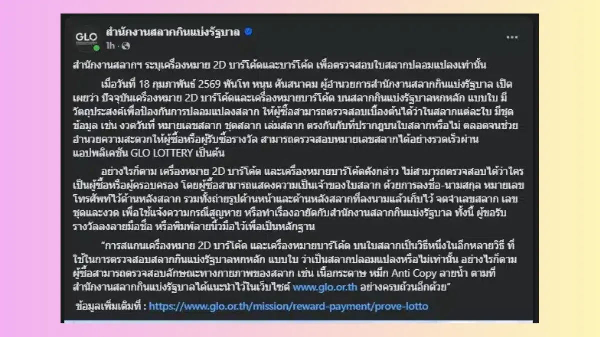 จากการตรวจสอบข้อเท็จจริงล่าสุดเมื่อวันที่ 18 กุมภาพันธ์ 2569 สำนักงานสลากกินแบ่งรัฐบาล โดยผู้อำนวยการสำนักงานสลากฯ ได้ชี้แจงอย่างชัดเจนว่า เครื่องหมาย 2D บาร์โค้ด และบาร์โค้ดที่ปรากฏบนสลากใบนั้น มีวัตถุประสงค์หลักเพื่อ "ป้องกันการปลอมแปลง" เท่านั้น รหัสเหล่านี้ถูกออกแบบมาเพื่อให้ผู้ซื้อสามารถตรวจสอบข้อมูลเบื้องต้นผ่านแอปพลิเคชัน GLO Lottery ว่างวดวันที่ หมายเลขสลาก ชุด และเล่ม ตรงกับใบสลากในมือหรือไม่ เพื่อยืนยันว่าเป็นสลากจริง ไม่ใช่สลากตัดต่อ