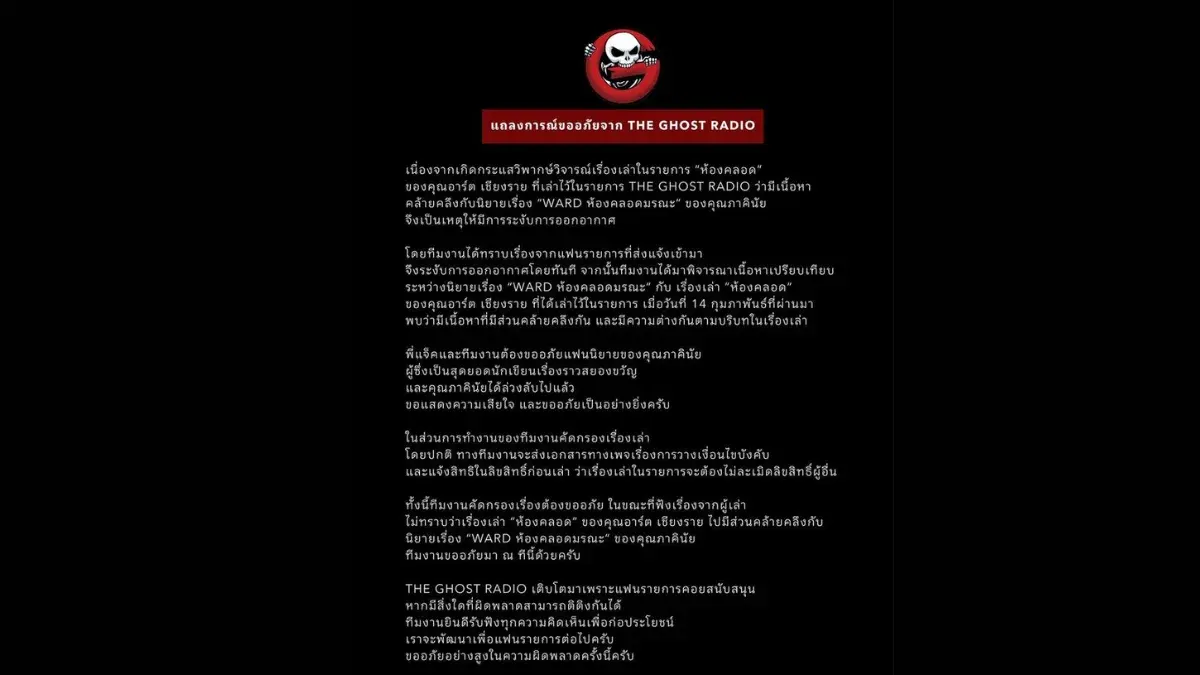 ดราม่าวงการเรื่องผีสั่นสะเทือนอีกครั้ง เมื่อรายการยอดฮิตอย่าง The Ghost Radio ต้องออกมาขออภัยแฟนรายการอย่างเร่งด่วน หลังพบว่าเรื่องเล่าจากทางบ้านมีเนื้อหาซ้อนทับกับนิยายสยองขวัญชื่อดัง จนเกิดกระแสวิพากษ์วิจารณ์ถึงความเหมาะสมและการตรวจสอบข้อมูลก่อนออกอากาศ ซึ่งเหตุการณ์นี้กลายเป็นบทเรียนสำคัญที่ย้ำเตือนถึงเรื่องลิขสิทธิ์และอรรถรสความสมจริงในวงการเรื่องเล่าสยองขวัญ