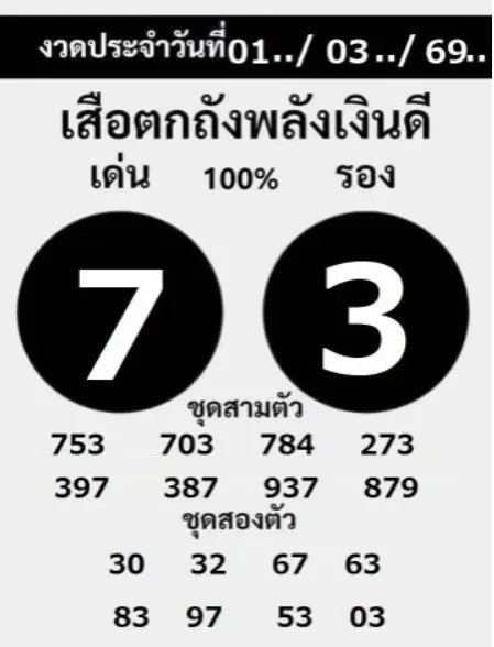 เลขเด็ด เสือตกถังพลังเงินดี สาย 1 งวดวันที่ 01/03/69 นี้ก็ได้ปล่อยทั้งเลขเด่น เลขดัง มาให้บรรดาคอหวยได้ไปช่วยพิจารณากัน สำหรับใช้เป็นแนวทางในการเสี่ยงโชคซื้อลอตเตอรี่ โดยงวดนี้มีเลขเด่น คือ 7 และรอง คือ 3 ส่วนตัวเลขในชุดอื่น ๆ ก็มีความน่าสนใจเป็นอย่างมาก สามารถไปดูที่ใบหวยด้านล่างกระทู้กันได้เลย