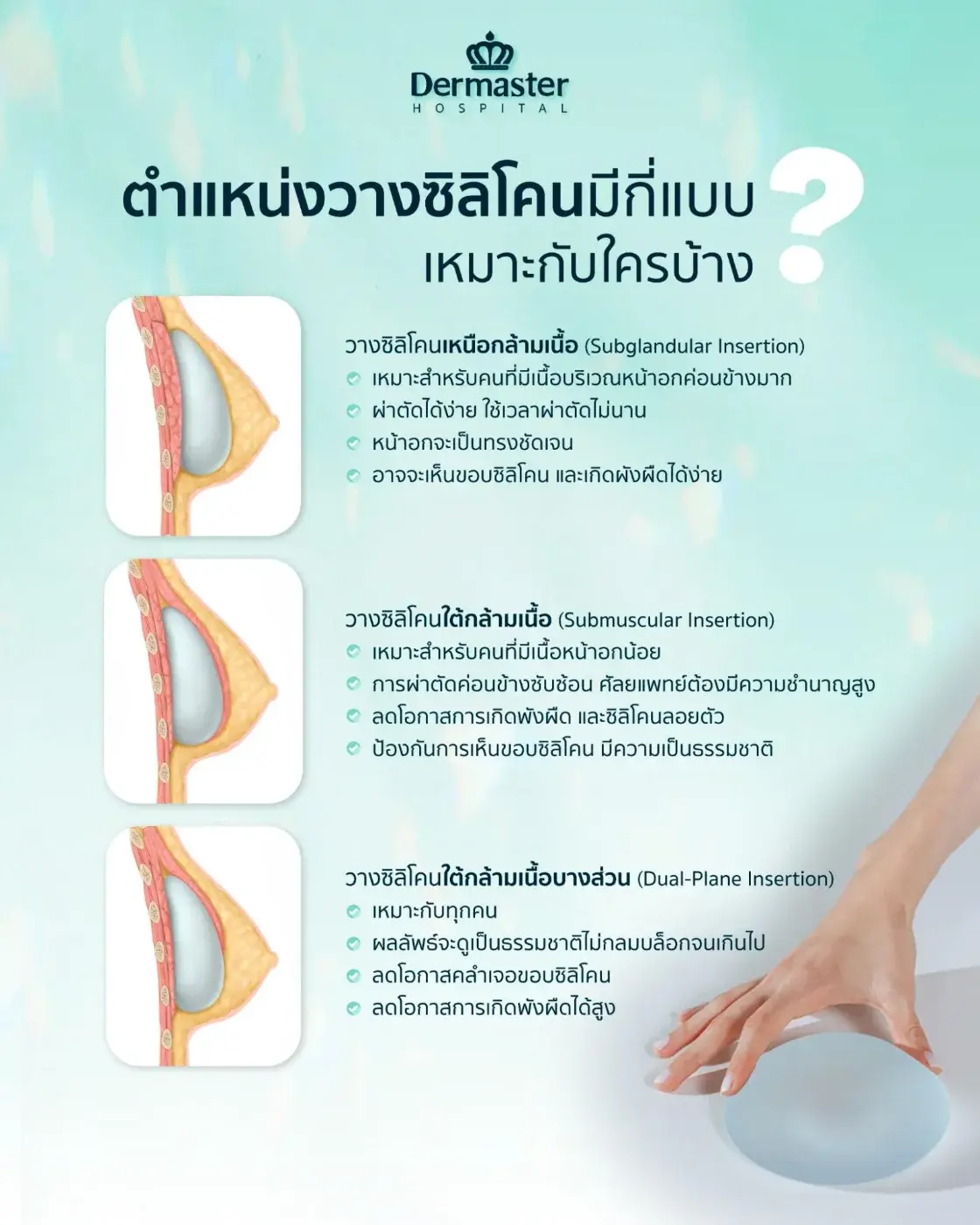 เมื่อตัดสินใจจะเสริมหน้าอกแล้ว นอกจากการเลือกขนาดและยี่ห้อซิลิโคน อีกหนึ่งสิ่งที่สำคัญมากคือเทคนิคการวางตำแหน่งซิลิโคนซึ่งแพทย์จะเป็นผู้ประเมินตามโครงสร้างร่างกายและปริมาณเนื้อหน้าอกเดิมของแต่ละคน เพื่อให้ผลลัพธ์การออกมาสวยงามและปลอดภัยที่สุด โดยแบ่งเทคนิคการวางซิลิโคนออกเป็น 3 แบบ ดังนี้