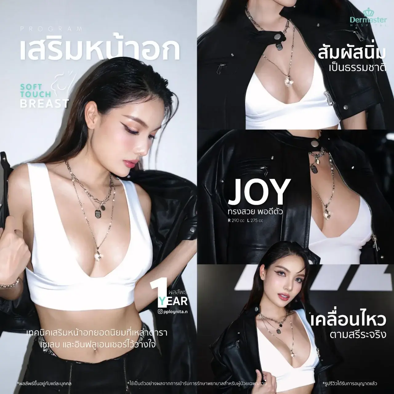 เทคนิคเฉพาะของ Dermaster Hospital ที่เน้นความนุ่มและดูเป็นธรรมชาติ เลือกใช้ซิลิโคนคุณภาพสูงอย่าง Motiva Joy ร่วมกับเทคนิคเฉพาะของศัลยแพทย์ เพื่อให้หน้าอกได้ทรงสวย เคลื่อนไหวเป็นธรรมชาติ สัมผัสนิ่ม ไม่แข็งเป็นบล็อก แผลเล็ก และพักฟื้นเร็ว